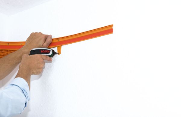 Wählen Sie an der Wand die entsprechende Höhe. Richten Sie diese mit einer Wasserwaage aus und zeichnen Sie die Bohrlöcher an.