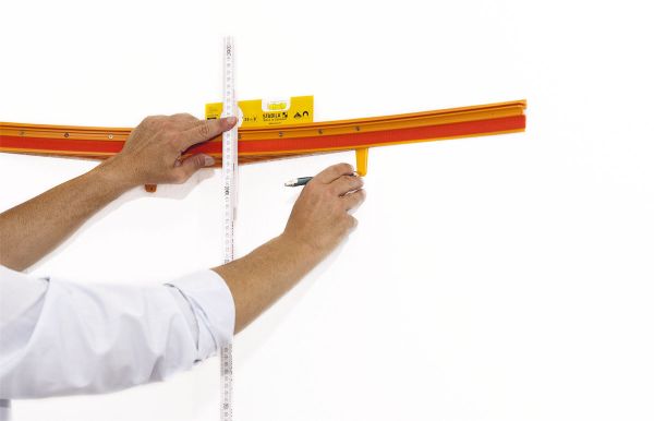Wählen Sie an der Wand die entsprechende Höhe. Richten Sie diese mit einer Wasserwaage aus und zeichnen Sie die Bohrlöcher an.